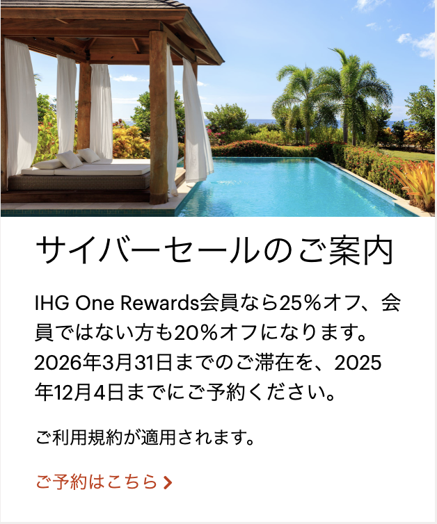 そしてホテルです。現在、IHGはサイバーセールを絶賛開催中です。来年3月末までの予約と事前前払いで残念ですが、全世界のホテルが25%割引です。