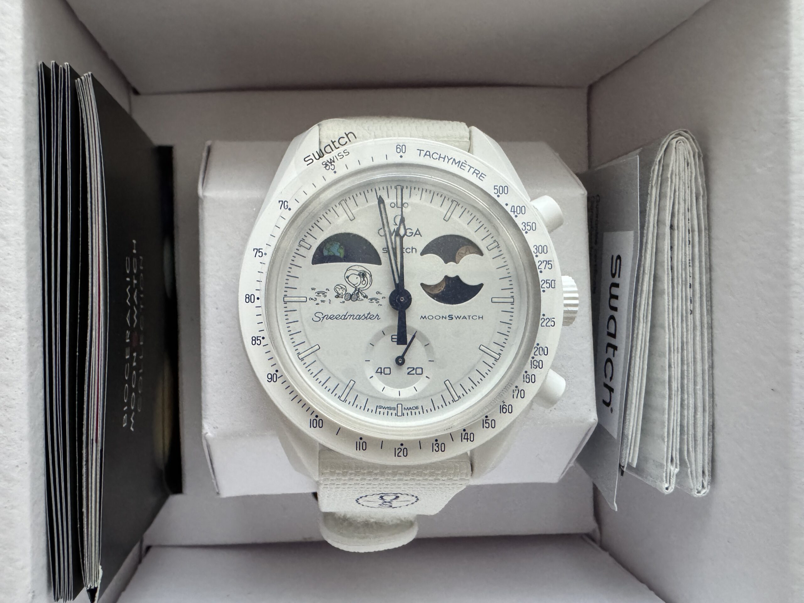 このコレクションのすべての時計の文字盤には、OMEGA X Swatchの文字、アイコニックなSpeedmasterのロゴ、そしてMoonSwatchのロゴが見られます。